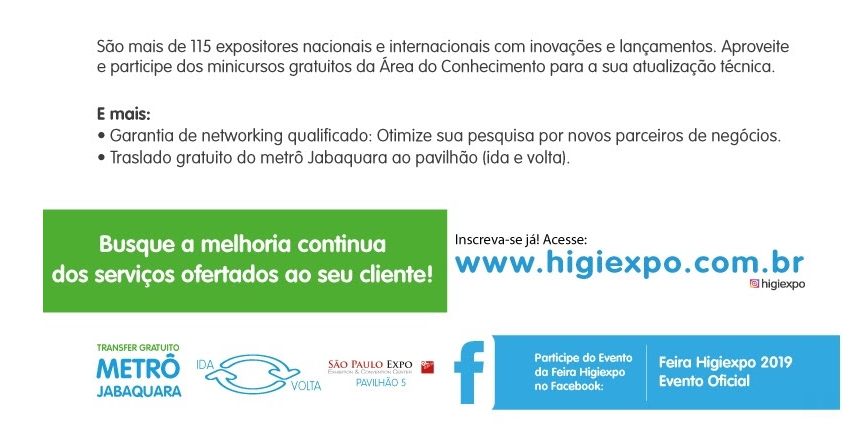 Febrac na Higiexpo 2019 A Febrac terá stand em uma das maiores feiras de produtos e serviços para higiene, limpeza e conservação ambiental da América Latina, a Higiexpo – Feira de Produtos e Serviços para Higiene, Limpeza e Conservação Ambiental, que ocorrerá no período de 20 a 22 de agosto em São Paulo/SP.
