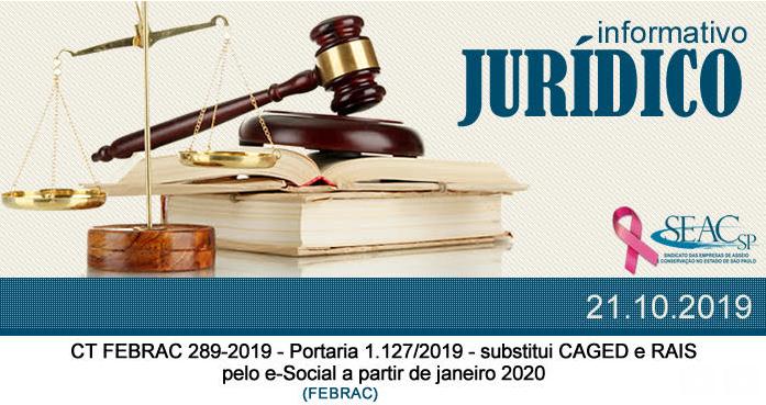 Segue abaixo, para conhecimento, link da Portaria 1.127, que define as datas e condições em que as obrigações de prestação de informações pelo empregador nos sistemas CAGED e RAIS serão substituídas pelo Sistema de Escrituração Digital das Obrigações Fiscais, Previdenciárias e Trabalhistas –eSocial, publicada no DOU do dia 15/10/2019. ACESSE AQUI A PORTARIA |