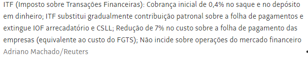 REFORMA TRIBUTÁRIA DA CÂMARA PODE AUMENTAR TAXAÇÃO DE SERVIÇOS EM 211% Setor representa 60% do PIB IVA é adotado em outros países Bancos terão carga tributária menor Se aprovada, a reforma que tramita na Câmara afetará o setor de serviços, que representa cerca de 60% do PIB (Produto Interno Bruto). Sérgio Lima/Poder360 03.set.2018 A PEC (Proposta de Emenda à Constituição) 45 de 2019 que altera a legislação tributária e tramita na Câmara dos Deputados deve aumentar a carga dos impostos no setor de serviços, que representa cerca de 60% do PIB (Produto Interno Bruto). Simulações aplicando as regras do texto à categoria hoje tributada pelo lucro presumido mostram que a alta pode chegar a 211%, dificultando empreendimentos no setor. Ao mesmo tempo, bancos terão redução na carga tributária. Como a proposta privilegia a cobrança de impostos sobre consumo, ela extingue a cobrança de Pis e Cofins, que incidem sobre a renda. De acordo com estimativa do economista Everardo Maciel, ex-secretário da Receita Federal, isso faria os bancos pagarem de R$ 25 bilhões a R$ 30 bilhões a menos à Receita Federal. O texto da PEC unifica ao todo 5 impostos para criar o IBS (Imposto sobre Operações com Bens e Serviço), que incide sobre o consumo e deverá ter uma alíquota única de 25% para toda a economia. A proposta foi aprovada em maio na CCJ (Comissão de Constituição e Justiça) da Câmara. Ainda precisa ser apreciada na comissão especial da Casa, ir ao plenário e depois ser enviada ao Senado. Entenda melhor abaixo como se dá esse aumento de impostos par ao setor de serviços: IMPOSTO SOBRE VALOR AGREGADOO IBS (Imposto sobre Operações com Bens e Serviço) é como os autores do projeto batizaram 1 tipo de imposto muito conhecido em outros países, o IVA (Imposto sobre Valor Agregado). Pela proposta em tramitação na Câmara, o IBS que terá 10 anos de transição, até ser totalmente implementado. Mas mesmo com este período de adaptação, analistas tributários avaliam que o efeito será danoso à economia porque deve aumentar o custo de mensalidades escolares e procedimentos em clínicas de saúde, por exemplo. Caso o cenário se concretize, o impacto mais provável é o desaquecimento da atividade econômica e aumento da inflação. O setor de serviços é o que tem maior impacto no PIB, com grande relevância na criação de empregos e renda no país. Os índices de atividade econômica mostram que, por conta da taxa de desocupação elevada e do baixo nível de consumo, a recuperação econômica ocorre de forma lenta. O IPCA (Índice Nacional de Preços ao Consumidor Amplo), que mede a inflação oficial do país está baixo, deve ser impactado pelo repasse nos preços. Com o aumento da carga tributária de 8% para 25% para serviços, os custos aos empresários serão repassados ao consumidor. “A alíquota alta finda por onerar fortemente o custo do serviço. A tendência é ter 1 aumento brutal da sonegação e alta dos preços. Isso é preocupante, porque gera inflação e tem impacto imediato na economia. Mesmo com o tempo de transição, o efeito não será absorvido integralmente e algumas empresas sofrerão fortemente a repercussão da tributação e podem até desaparecer”, afirmou Heleno Taveira Torres, vice-presidente da IFA (International Fiscal Association) e professor de direito financeiro da USP. Everardo Maciel, consultor tributário e ex-secretário da Receita Federal, afirmou que as empresas optantes do regime do lucro presumido serão as que “vão pagar a conta” da reforma. “Constituem, principalmente, pequenos e médios prestadores de serviços, como clínicas, escolas, escritórios de advocacia, de engenharia, de arquitetura e outros. E os créditos são pequenos nessas áreas“, destacou. Uma das justificativas que dão base ao IBS com alíquota única é a classe econômica que utiliza tais serviços, que, segundo analistas e defensores da PEC 45, são os mais ricos. Maciel discorda do posicionamento e afirma que o aumento da tributação inviabilizará que o acesso aos serviços por parte da sociedade. “Quem frequenta escola e quem vai é rico? Teria que pagar mais imposto? Isso não é verdade. A grande motivação que as pessoas têm para apoiar a reforma é a redução da carga tributária, mas ela aumenta com esta reforma. Outra vítimas são os pobres, que hoje têm isenção da cesta básica, que passará a ser tributada. Tem muita especificidades que não deveria estar nessa proposta”, destacou Everardo Maciel. Se aprovada, a reforma também também deve estimular com que empresas e trabalhadores do setor tentem, mesmo que por via ilegais, ser tributados pelo Simples Nacional, que tem carga tributária diferenciada e ficou de fora das mudanças na legislação, assim como o MEI (Microempreendedor individual). “As empresas vão utilizar de artifícios, quebrar vínculo de trabalho, quebrar a sociedade ou a estrutura organizacional, ou fazer qualquer comportamentos anômalos para escapar da alíquota de 25%. Todos vão tentar fugir, e a reforma vai ensinar aos empresários a fazerem truques”, afirmou o ex-secretário da Receita Federal. Nos dados de setembro, os mais recentes do Fisco, havia 14 milhões empreendimentos optantes pelo Simples e 9 milhões, pelo MEI. BANCOS TERÃO VANTAGEMO setor financeiro ganhará com a proposta de reforma da Câmara, se aprovada. A expectativa é de que os bancos, por exemplo, paguem de R$ 25 bilhões e R$ 30 bilhões a menos em tributos anualmente, segundo estimativa de Everardo Maciel. Isso porque não haveria mais o pagamento com o PIS-Cofins, que tributa a renda. Pela lógica da PEC, de incidir as alíquotas apenas sobre o consumo, as instituições seriam desoneradas em cifras bilionárias. Em 2018, as entidades financeiras pagaram R$ 21,236 bilhões em PIS-Cofins e R$ 3,015 bilhões em atividades auxiliares, totalizando R$ 24,775 bilhões ao todo. Valor deixaria de ser pag