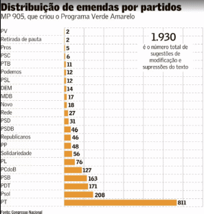 O governo tenta impedir que as 1.930 emendas apresentadas por deputados e senadores desvirtuem completamente a MP 905, que criou o programa Verde Amarelo. Segundo a argumentação do governo, a proposta, caso aprovada, poderia viabilizar a criação de 1,8 milhão de empregos para jovens entre 18 e 29 anos entre 2020 e 2022. Do total das emendas, o PT apresentou 811, seguido pelo Psol (208) e PDT (171). Muitas das emendas pedem a supressão da desoneração da folha de salários dos empresários e do pagamento de alíquotas do Sistema S e do salário-educação, pontos que fazem parte da coluna dorsal da proposta do governo. Essas isenções seriam bancadas pela cobrança de contribuição previdenciária do segurodesemprego, medida que também enfrenta forte resistência.
