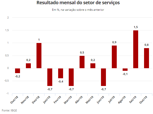 O volume do setor de serviços cresceu 0,8% outubro, na comparação com setembro, segundo divulgou nesta quinta-feira (12) o Instituto Brasileiro de Geografia e Estatística (IBGE). Na comparação com outubro do ano passado, a alta foi de 2,7%.