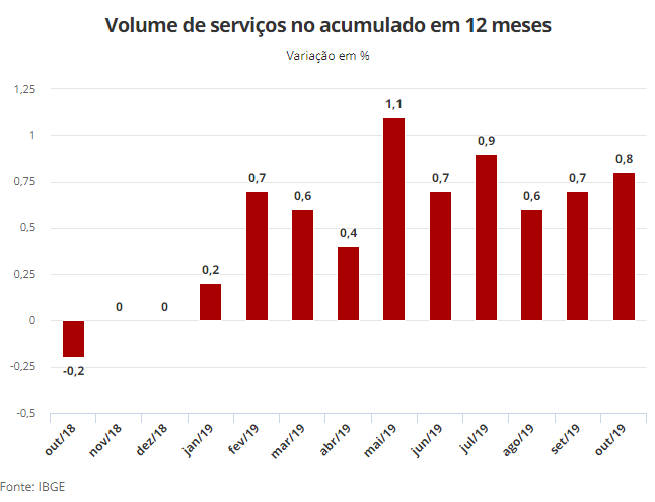 Segundo o IBGE, o setor de serviços assinala um crescimento acumulado de 3% entre julho e outubro deste ano, revertendo a perda de 1,8% observada no período entre janeiro e junho de 2019 e avançando 1,2% frente ao patamar de dezembro de 2018.