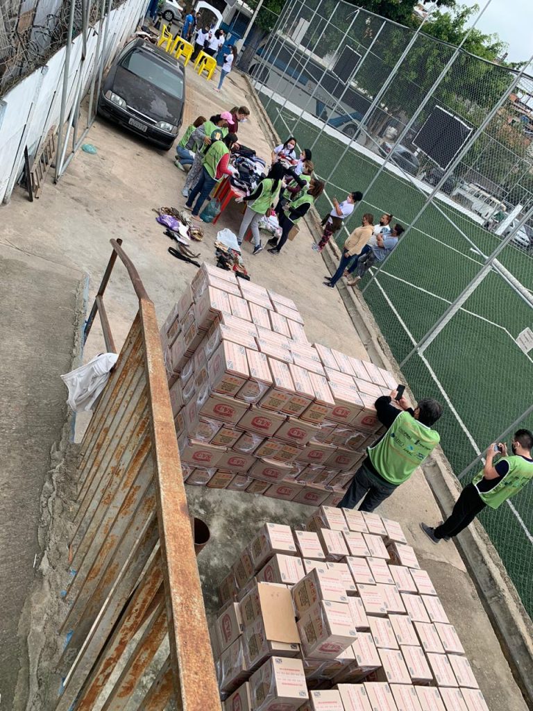 Conseguimos montar 200 cestas de alimentos, 200 cestas-kit de higiene pessoal e doméstico; 200 cartelas de ovos com 30 unidades cada (porque vimos a necessidade de doar pelo menos uma fonte de proteína), roupas, sapatos e máscaras.