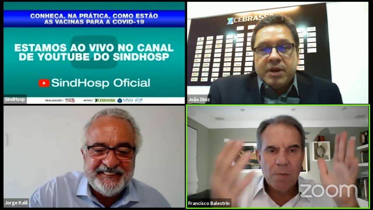 Com o apoio da Cebrasse, o SindHosp realizou, em 18 de março, o Webinar “Conheça, na prática, como estão as vacinas para Covid-19”. O evento teve como convidado o professor titular de Imunologia da Faculdade de Medicina da Universidade de São Paulo e diretor do Laboratório de Imunologia do Instituto do Coração, Jorge Kalil, e como moderadores o presidente do SindHosp, Francisco Balestrin, e o presidente da Cebrasse, João Batista Diniz Jr. O Webinar contou com o apoio da Cebrasse e da MXM Sistemas.