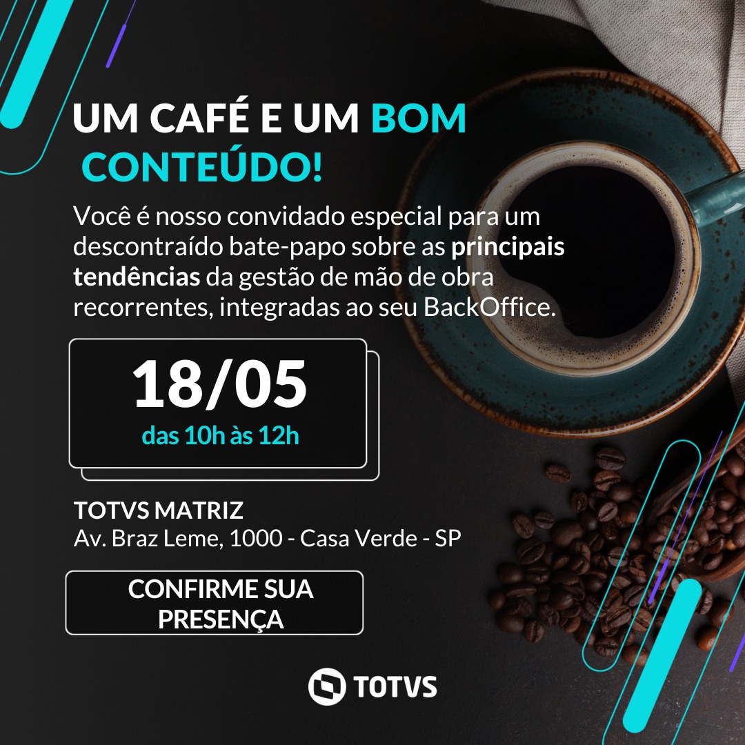 Você é nosso convidado especial para um café e um bom conteúdo descontraído com muita troca de experiências sobre as principais tendências da gestão de mão de obra recorrentes, integradas ao seu BackOffice. Além dos grandes pilares do Protheus e alguns produtos complementares.