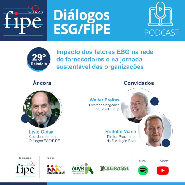 No dia 4 de setembro de 2023, ocorreu o 29º episódio do Podcast da Fipe (Fundação Instituto de Pesquisas Econômicas), com o apoio da Central Brasileira do Setor de Serviços (Cebrasse). Este episódio fez parte da série “Diálogos ESG/FIPE” e trouxe uma discussão relevante sobre o “Impacto dos fatores ESG na rede de fornecedores e na jornada sustentável das organizações”.