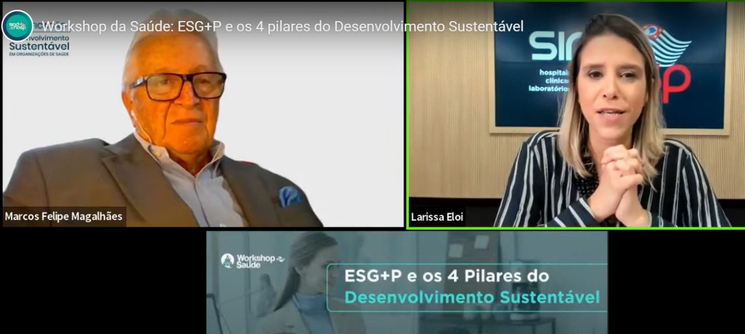 Durante quase uma hora e meia, a diretora Executiva do SindHosp, Larissa Eloi, conversou com o professor e pesquisador Marcos Felipe Magalhães, autor do livro “Estratégias do Desenvolvimento Sustentável: ASG+P” e coordenador geral da certificação do Colégio Brasileiro de Executivos da Saúde (CBEXs). Intitulado “ESG+P e os Quatro Pilares do Desenvolvimento Sustentável”, o workshop tratou dos desafios das organizações de saúde em torno dos fundamentos expressos na sigla ASG+P (ou ESG+P, em inglês): ambiente, sociedade, governança e pessoas. “Esse é um tema complexo, ousado e inovador, que tem de estar na agenda das empresas da área da saúde de todos os portes”, destacou Larissa Eloi na abertura do evento.