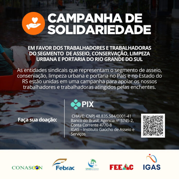 “Durante a campanha, vamos doar e arrecadar recursos financeiros que serão destinados especialmente aos trabalhadores do setor de serviços terceirizáveis, que perderam tudo.  Todo e qualquer apoio é fundamental para ajudarmos a reconstruir e proporcionarmos esperança e conforto a quem mais precisa”, comenta Edmilson Pereira, presidente da Febrac.