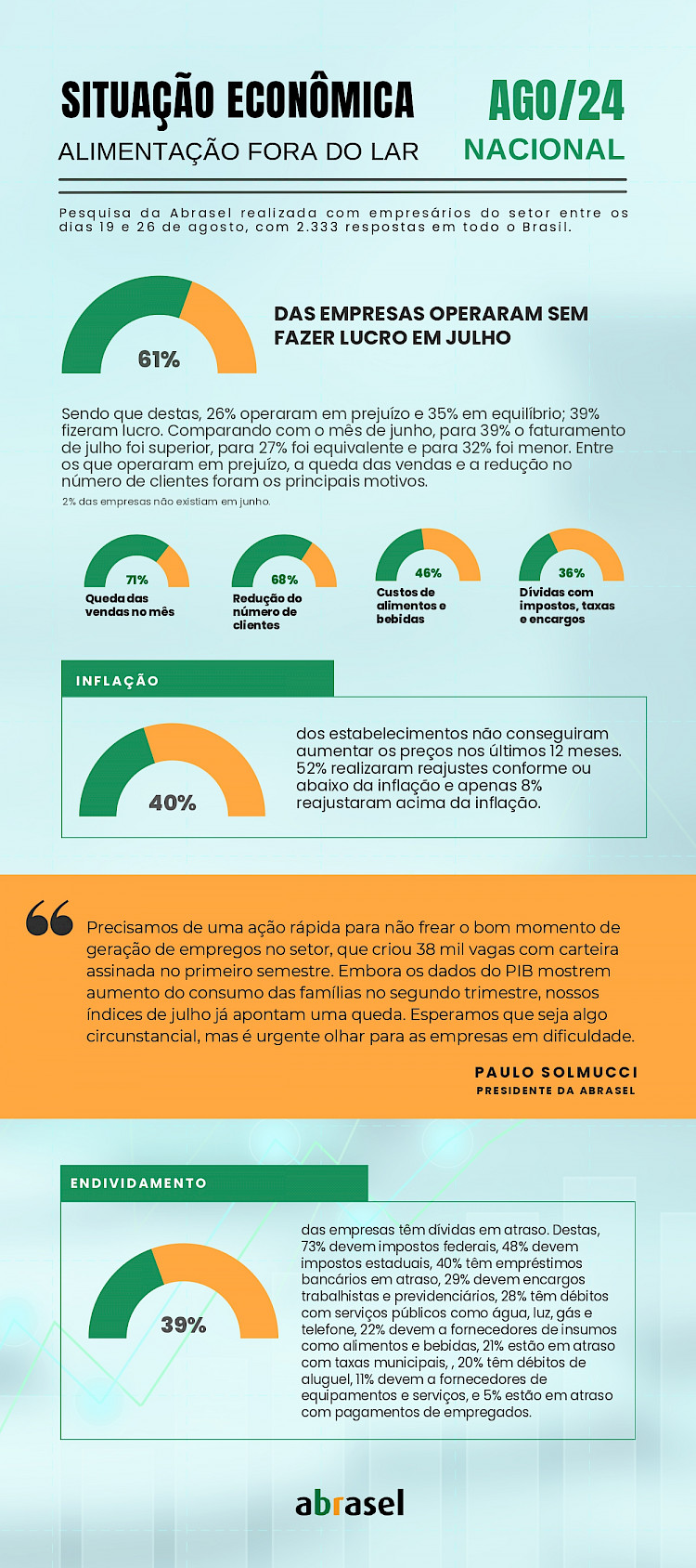 O índice de empresas operando com prejuízo também aumentou ligeiramente, passando de 24% em junho para 26% em julho de 2024. Entre os que registraram prejuízo, 71% atribuíram a situação à queda nas vendas, e 68% à redução no número de clientes. Outros fatores relevantes incluem o custo de alimentos e bebidas (46%) e as dívidas com impostos (36%).