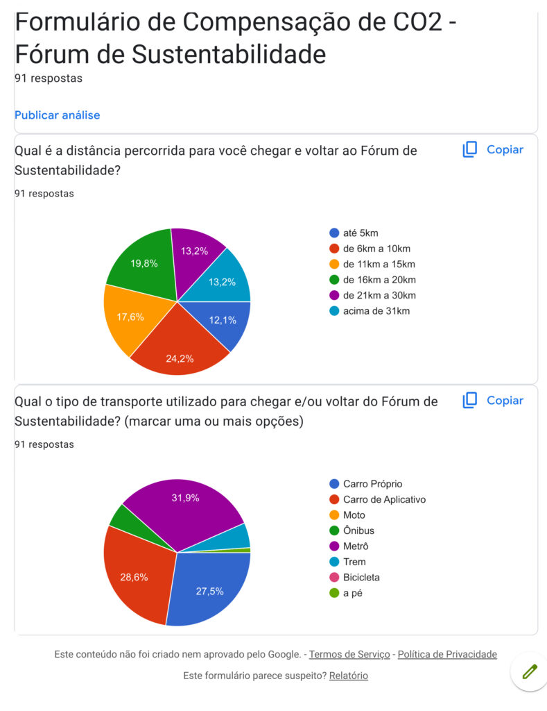 Com 91 respostas registradas, o formulário coletou dados sobre o deslocamento ao evento incluindo a distância percorrida e o meio de transporte utilizado pelos participantes para ir e voltar do fórum. Os resultados revelam não apenas o perfil de mobilidade do público, mas também reforçam a necessidade de buscar alternativas mais sustentáveis no dia a dia corporativo.