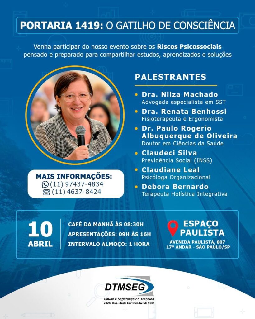 O evento pretende discutir não apenas os aspectos técnicos da norma, mas principalmente os impactos que ela provoca nas empresas que decidem ir além do cumprimento formal das exigências legais. A proposta é analisar como a nova regulamentação pode influenciar práticas de gestão, cultura organizacional e governança de riscos laborais.